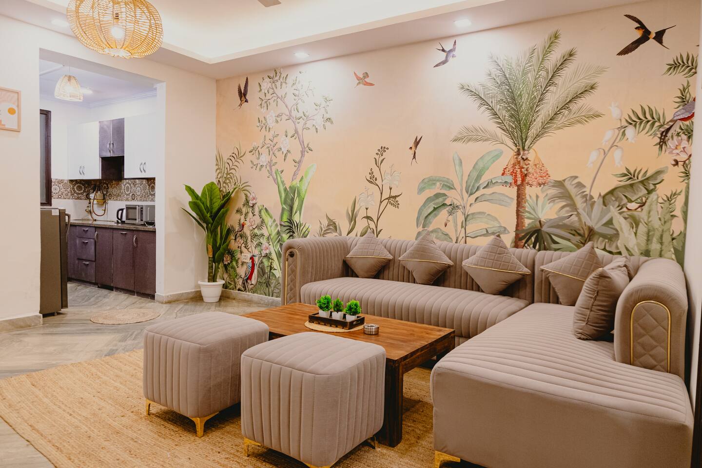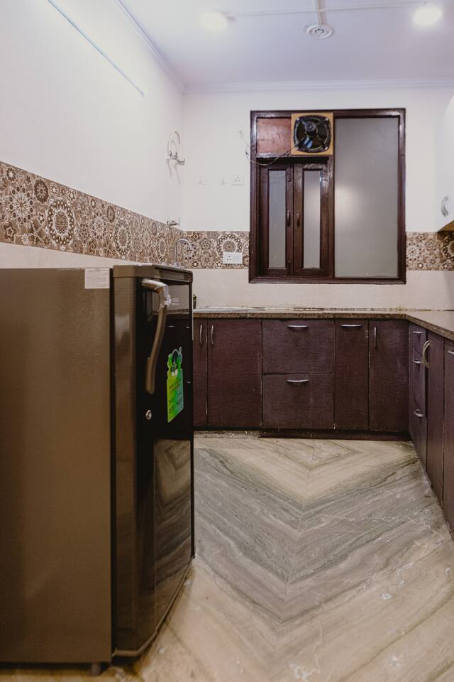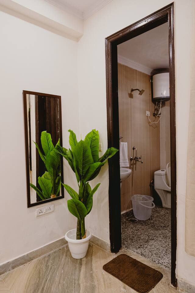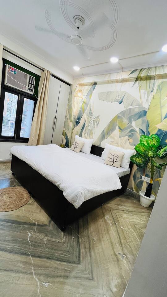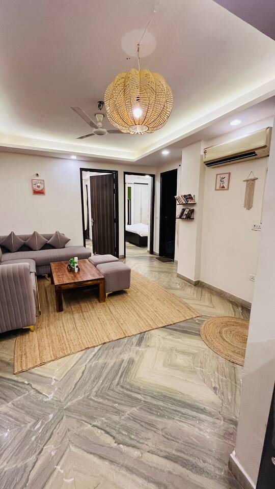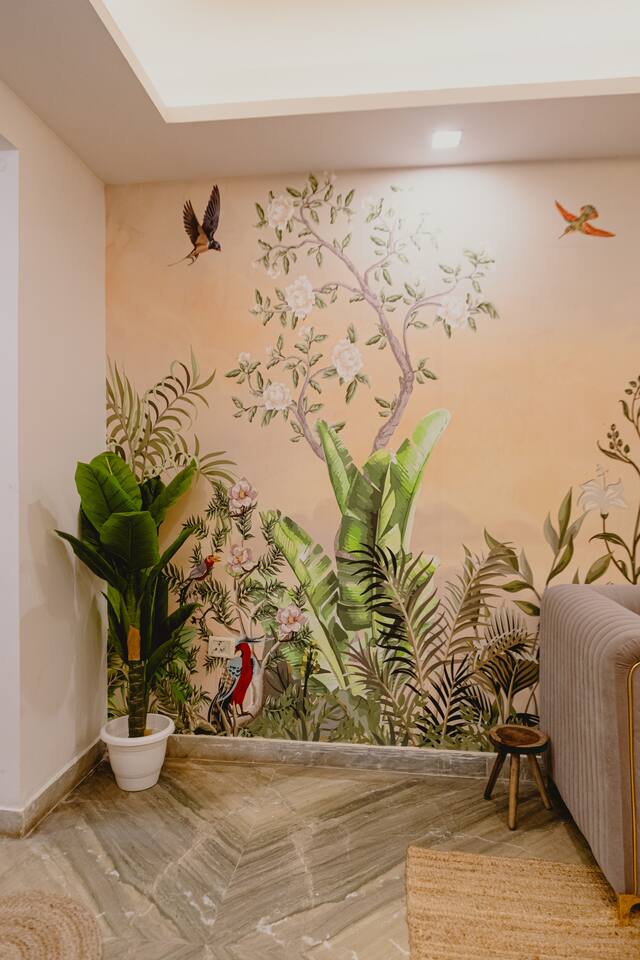 Step into a space where vibrant boho style meets the tranquility of tropical living. Our home is thoughtfully designed with modern amenities and tasteful décor that combine both style and comfort. From lush plants to colorful accents and beautiful patterns, every corner of our home invites you to relax and embrace the peaceful surroundings. Whether you're unwinding in the cozy living room, preparing a meal in the fully stocked kitchen, or retreating to one of the spacious bedrooms, our tropical boho escape offers the perfect setting for your Chattarpur stay. With an elevator to ensure easy access to all floors, comfort and convenience are always within reach. Enjoy the ideal blend of modern luxury and tropical bliss. Book your stay now and experience the charm of our Dhan Mill haven. Key Features: Only 5 minutes away from the Dhan Mill Complex, home to trendy boutiques and cafes. Spacious living room perfect for relaxation or socializing. Three chic, air-conditioned bedrooms with vibrant décor. Fully equipped kitchen ready for culinary creativity. Elevator access for easy and convenient movement. A great space for professionals seeking a productive retreat. Easy access to Delhi’s nightlife and cultural attractions. Perfect for family getaways, leisure stays, or business trips.