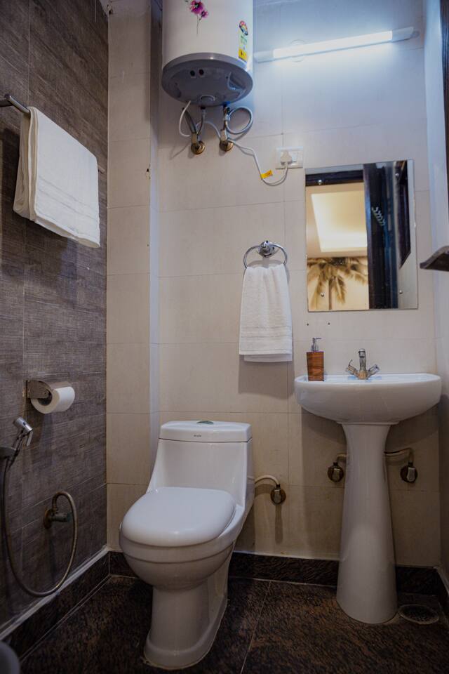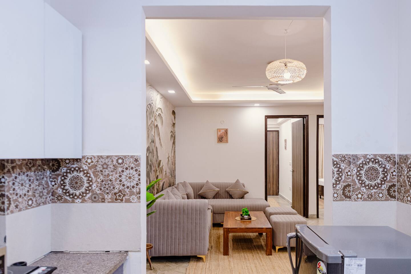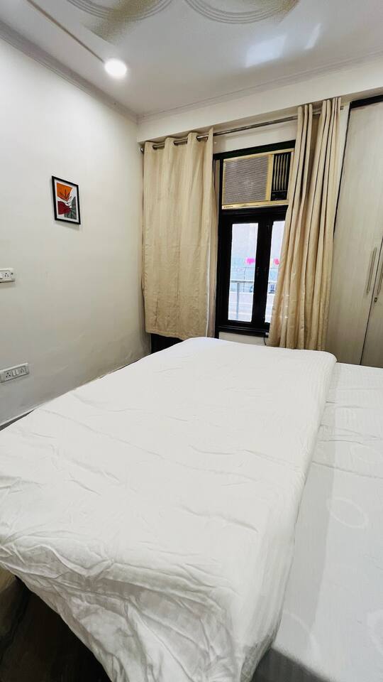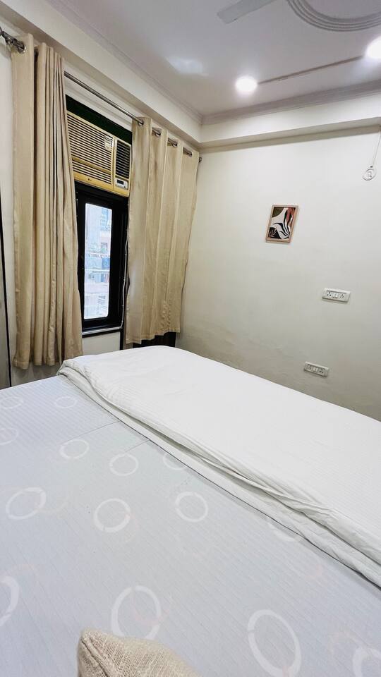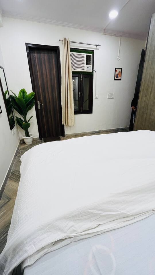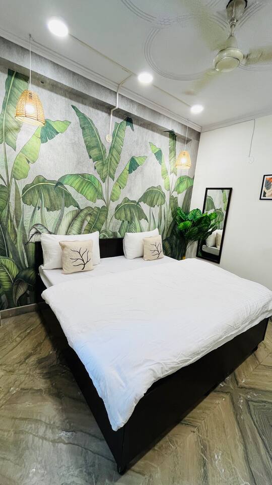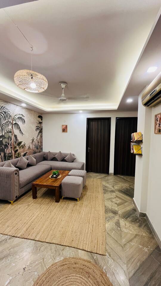"Welcome to a vibrant fusion of boho style and tropical tranquility. Our home is carefully designed with modern comforts and beautiful décor, offering a perfect blend of style and relaxationFrom lush greenery to colorful accents and intricate patterns, every corner of our home invites you to unwind and enjoy the serene atmosphere. Whether you're relaxing in the cozy living room, cooking in the fully equipped kitchen, or retreating to one of the spacious bedrooms, our tropical boho escape is the ideal destination for your Chattarpur stay. With the added convenience of an elevator, comfort is always within easy reach. Experience the ultimate combination of luxury and tropical bliss. Book your stay now and enjoy the charm of our Dhan Mill sanctuary. Key Features: Just 5 minutes away from the Dhan Mill Complex, featuring luxury boutiques and cafes. A spacious living room perfect for both relaxation and socializing. Three chic, air-conditioned bedrooms with vibrant and stylish décor. Fully stocked kitchen for culinary creativity. Elevator access for convenient and effortless movement. Ideal for professionals looking for a productive retreat. Easy access to Delhi’s nightlife and cultural attractions. Perfect for family getaways, leisure stays, or business visits."