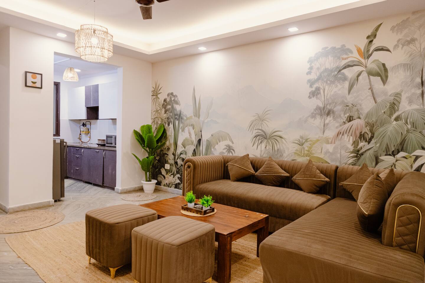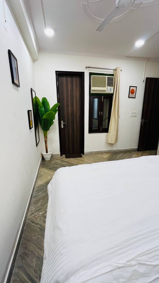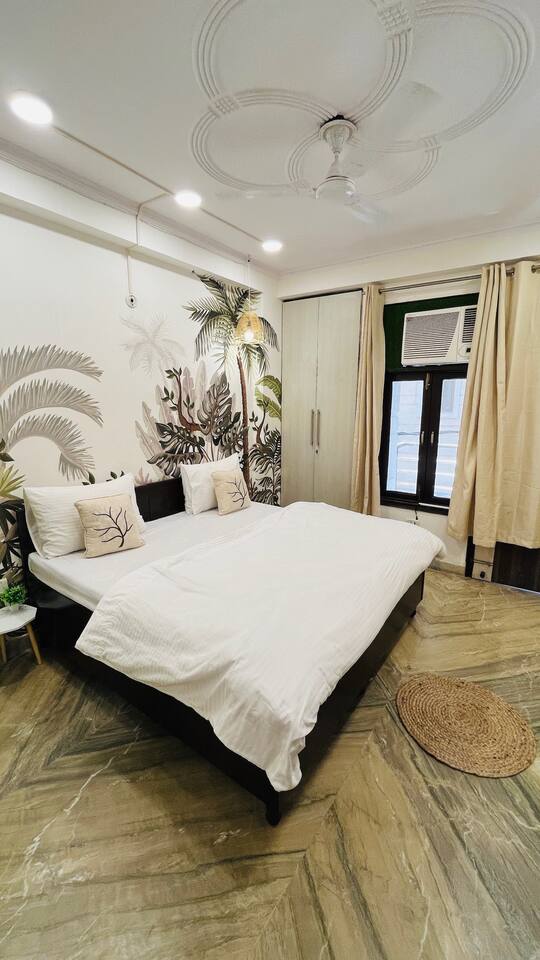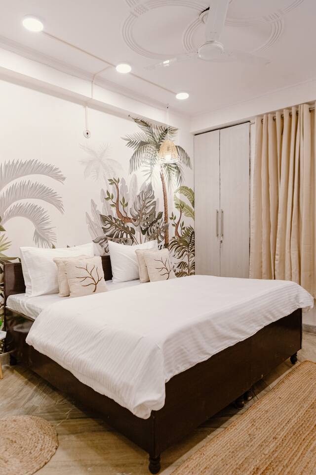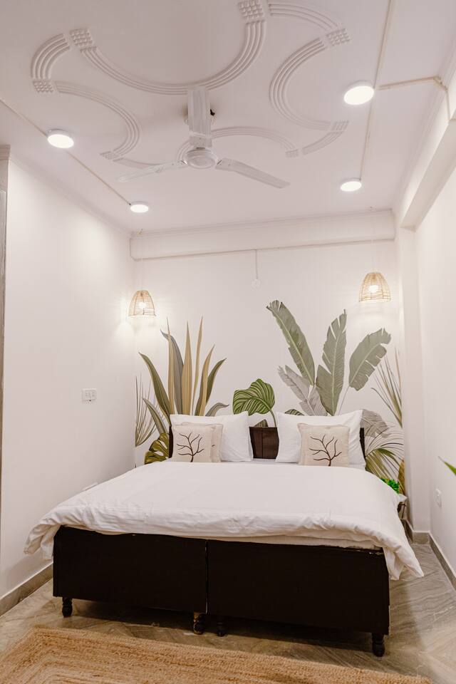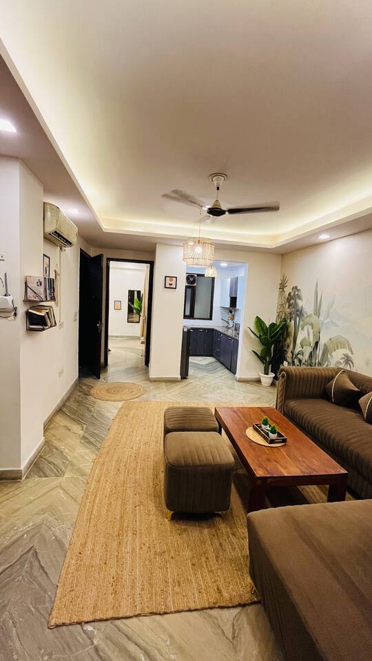 "Welcome to our home, where vibrant bohemian style meets the relaxed charm of tropical vibes. Designed with modern comforts and chic decor, every detail blends beauty with functionality. With lush greenery, pops of bold color, and intricate patterns throughout, our space invites you to unwind and soak in the peaceful ambiance. Whether you're lounging in the cozy living room, cooking up a storm in the fully equipped kitchen, or retreating to one of the spacious bedrooms, our tropical boho haven is the ideal place for your Chattarpur getaway. Plus, with an elevator for easy access to all levels, comfort is just a step away. Embrace the perfect mix of modern convenience and tropical relaxation. Book now and discover the allure of our Dhan Mill retreat. Key Features: Just 5 minutes from the Dhan Mill Complex with luxury boutiques and cafes. Spacious living room for relaxing or entertaining. Three stylish, air-conditioned bedrooms with bold décor. Fully equipped kitchen for culinary adventures. Elevator access for easy convenience. Ideal space for professionals needing a creative environment. Easy access to Delhi's vibrant nightlife and cultural gems. Perfect for both leisure and business stays."